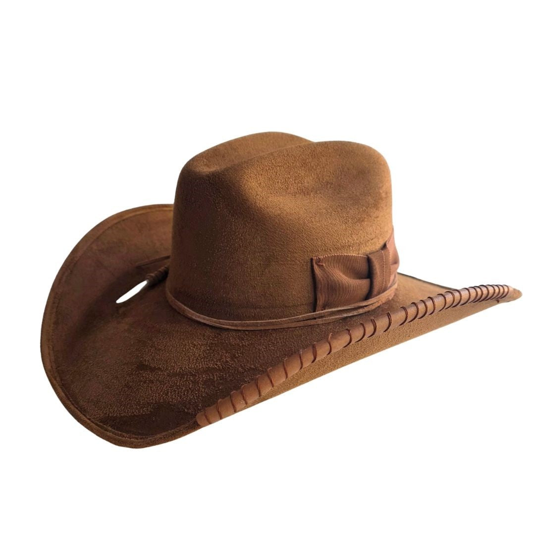 STYLE Cowboy MATERIAL Polyester Suede HAT COLOR Tobacco BAND Delicate Tobacco Ribbon Bow leather cord, feather BRIM 4" CROWN 4" SHAPE Structured Hat FITTED Elastic inner band SHAPE Structured Hat